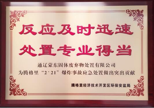 专家组领导及腾格里经济技术开发区政府对通辽蒙东的快速反应以及专业的处置方案给予了高度好评。腾格里经济技术开发区环保安监局特授予蒙东公司“反应及时迅速,处置专业得当”的荣誉证书及牌匾,感谢通辽蒙东公司在此次爆炸事故中所做出的贡献。